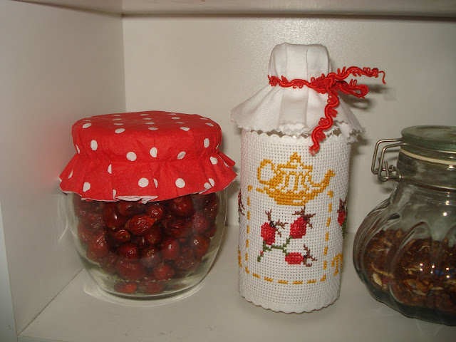 A čo som z výšivky urobila? Len som trocha prizdobila fľaštičku, do ktorej som si dala už rozdrvené šípky pripravené na čaj: