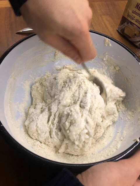 Najskôr si urobí kvások, ale nie tak, ako ho robím ja. Múku premiešal so sušeným droždím a vody pridal asi toľko, koľko múky, teda dostal hustú hmotu, ktorú zavrel a nechal celú noc kvasiť: